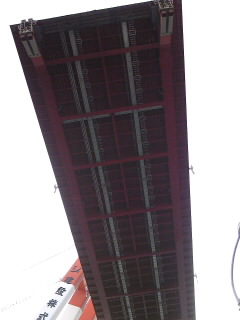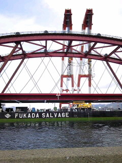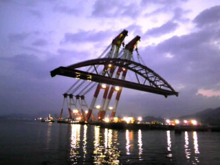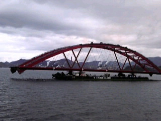 工場の中で、ブロック組立された、橋は、台船で運ばれ、出番を待ちます。