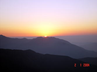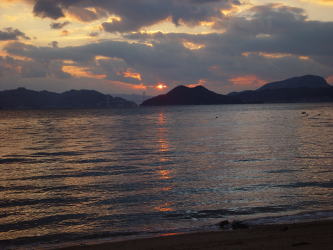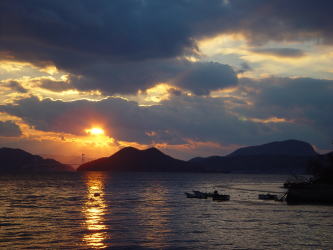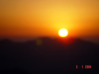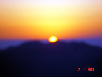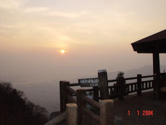 | 2004年が始まりました。その朝日は大晦日に沈んでいったものです。そしてまた2004年1月1日元旦の初日の出が沈もうとしています。それは今年の平穏無事を物語っているかのごとく静かに静かにまたくる明日のために沈んでいっています。 ということで、源さんは初日の出が沈む夕日を呉のシンボル灰が峰から見たようです。源さんは日の出より夕日が好きなようです。源さんが2004年のお正月に撮られた写真が届きましたので載せていきます。 |