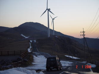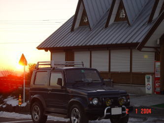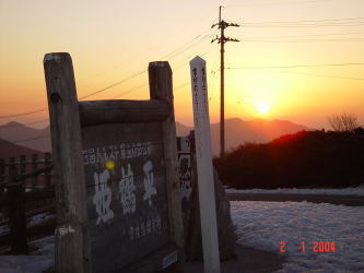 | 夕日をみたあと雪山でも走りに行こうかと思っていたらしいのですが、念願だった四国に突然行って見ることにしたようで2004年1月2日、源さんの誕生日の日の出の写真は四国の四国カルストで撮影したものでした。空気のピンとはった冷たさと清んだ雰囲気がひしひしと伝わってきます。静かできれいなところですねぇ。そして広島でも中国山地に行かなければ雪はありませんが、ここには雪があります。 | |