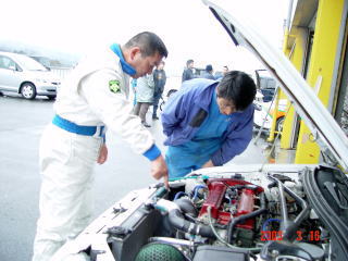 佐々木社長さん | ランサーのドグミッションを新しく造り、タカタサーキットのコースレコード保持者であり、古い知り合いでもある内藤さんに声をかけてみたら了解を得ることが出来たので喜んでいます。 テストでコースレコードも塗り替えられ安心しました。 各サーキットでコースレコードを更新してほしいと思います。 ※ドグミッションについての詳しい説明はBSTグループのホームページへ |