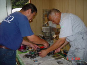 ![]() エンジンルーム内をのぞきこむ 内藤さんと藤井さん |