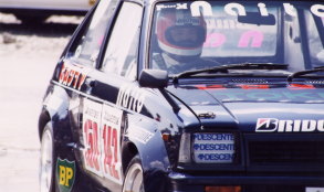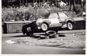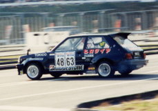 駆け抜けるKP61スターレット。決して美しくは無い走りだが、力強さは誰にも負けない。この当時ジムカーナも転戦シリーズを試験的に行っていたが、その中国ラウンドではあまりにも激しい走りで片輪走行は当たり前で、“内藤サーカス”とまで言われていた。