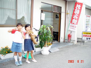 | お好み焼き吉甲の永弥(えみ)ちゃん(写真右)と友達のるりかちゃんは仲良しです。深津小学校の三年生。 | 吉甲の清潔な店内、磨きがかかった鉄板 |