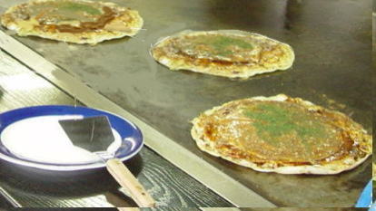 | 谷口さんと源さん | 鉄板でコテを使って食べます。 |