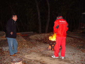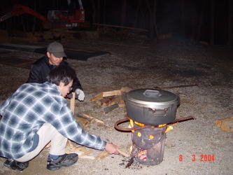 | まだまだ源さんは作業をしています。藤井さんが手伝ってくださいました。外ではこだやんや笹さんやF沖さんが火をおこしてくれています。源さんが作業も終わり準備が出来たところで一番風呂に入湯です。 | |