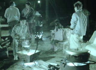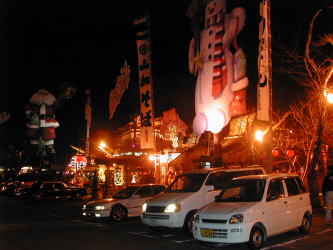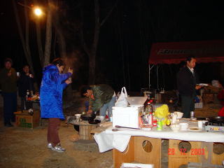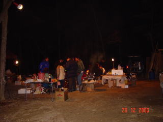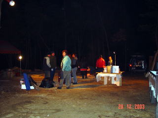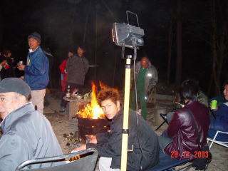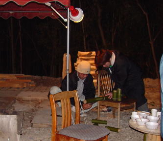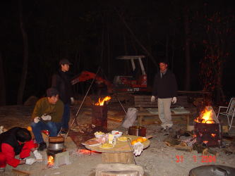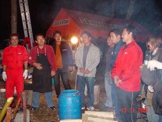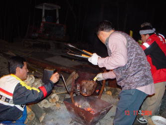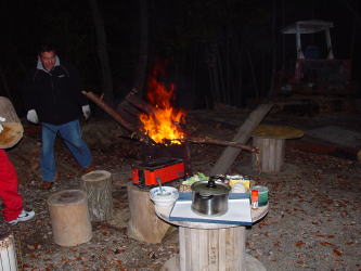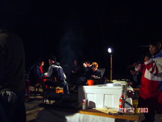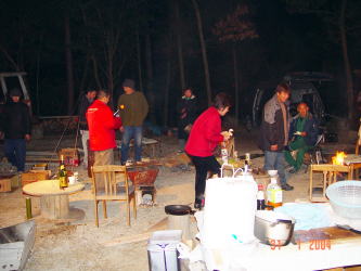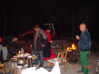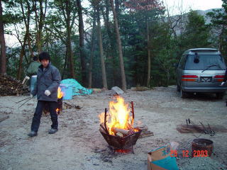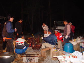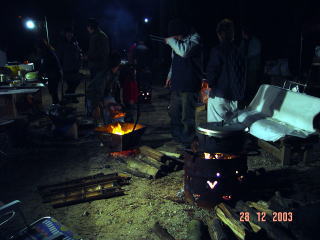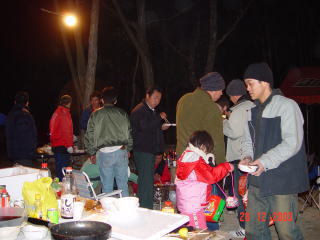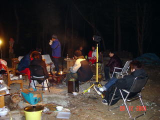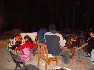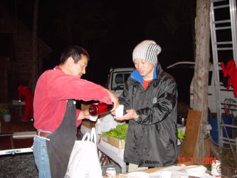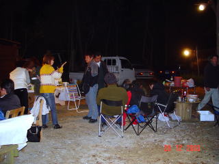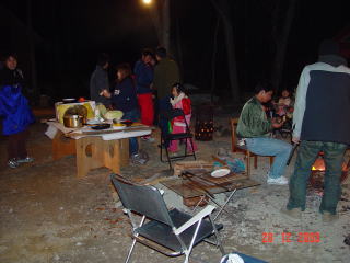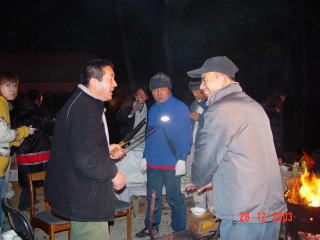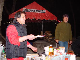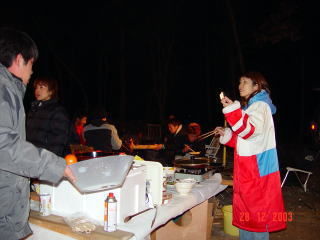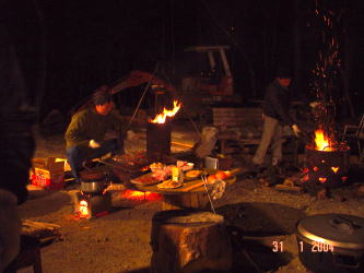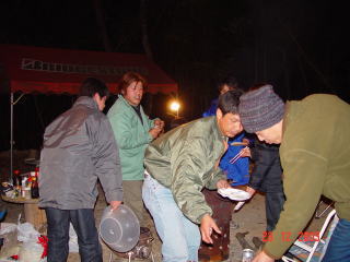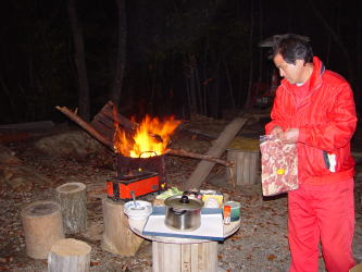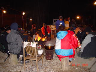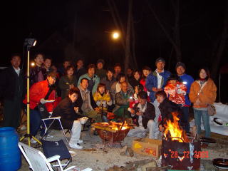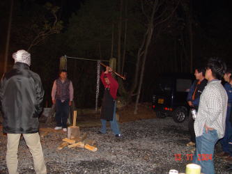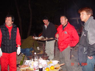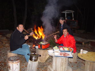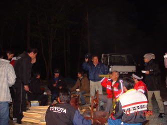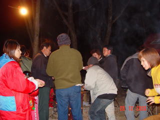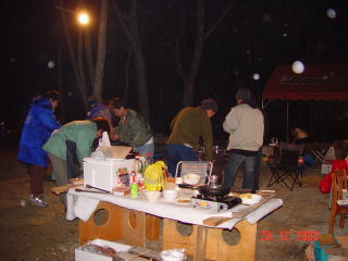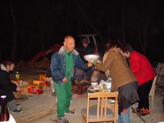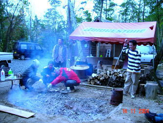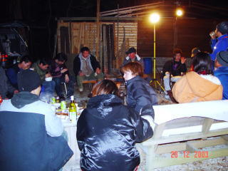 | 毎年盛大に行われる忘年会ですが、今年はその忘年会にあわせて源さんがまた山小屋に新しいスポットを作りました。まだ夏の暑さの残る秋口より手作りし始めた露天風呂を忘年会の日に完成させようということでした。そして忙しい合間をぬって何日も徹夜をしながら作った露天風呂は完成しました。皆の頭にあるのはすごいという一言と今度は何が出来るのだろうかということでした。午後より支度を始めるつもりが源さんはまだシャベルカーにのり作業をしています。充分出来ているのにもう少し本人の気にいらないみたいです。早く来た方たちで火をおこし準備をしていきます。今回は久々に源さんから肉の丸焼きをしたいとリクエストがありました。忘年会では恒例のかきの殻つきもあります。なべはちゃんこ鍋で肉から魚から何でも入ります。KUBOTAくんがわざわざ山陰から買ってきてくださった蟹もありますし、鍋用のふぐもあり超豪華版です。飲む人が少ないぶん、食が進みます。KUBOTAくんにKUBOTA亭の焼そばを作ってもらうとあっという間になくなってしまいます。今回はソース味と塩味の二種類がありました。その他は八宝菜やイカキムチなどなど色々なものとデザートはフルーツポンチでした。 | |