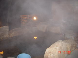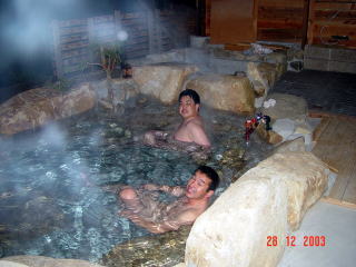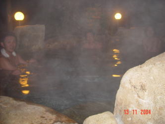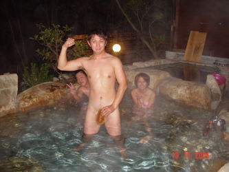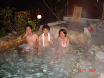 | 露天風呂にも順番に入ります。皆、思いっきり楽しんでいます。長湯の三人は、美女と野獣二人で美女の取り合いをしているか・・・と思いきや、中でめちゃ楽しく遊んでくつろいでいます。 とにかく外にいる皆は気が気でなく、気になってしかたないって感じでした。 「今ごろどうなっているんだろ」と質問が飛び交います。一緒に入ればいいのにと言っても、「いやいや・・・そこまでは・・・(照れ笑)」なんて具合で。 いやいや、他の皆も「いい湯だったね」って内湯(ないとう)゛闇湯(やみゆ)゛は人気ものです。 |