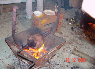 | 6kgの肉の塊をぐるぐると廻します。焼けたところに塩コショーとバターとレモン汁をかけてはこんがりと焦がし薄く削ぐのがNaito-Party流です。絶品です。 | |