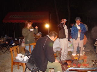 | 次の朝、一睡もしてない源さんとTO-RUくんを皮切りに、早起きのアナ西元さんは7時頃起床で、一番にダウンした河内さんは8時頃、続いて3時頃まで起きていた梶岡さん、コック長、川越さんと次々に起きてこられました。 朝ご飯が何もなかったので、またまた牡蠣を焼いて食べ、スポドリ(梶岡さん命名)をのみながら、誰かはまたまた向かい酒をして、軽快なトークに花を咲かせました。 昨日のことはほとんど覚えていない日本酒組は、「牡蠣は一つもたべてないから、これから食べよう」「焼そばは食べてない」などというと「二人とも、一番よ〜け、食べようたのに」と突っ込みが入ります。 NAITOの若い衆に、「わしらに顔を覚えて貰おうと思えば、朝のこの時にいなきゃダメだ・・・」と伝言でした。 とにかく皆、元気です。楽しんでもらえたら本当に良かったですね、源さん。 荷物を積み込み、10時過ぎ、源さんの山小屋を後にされました。お疲れ様。 |