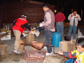 | ヒロ板金の社長、たけもとさんも来てくださいました。 | 肉の塊はあっという間に小さくなっていきます。 |