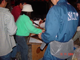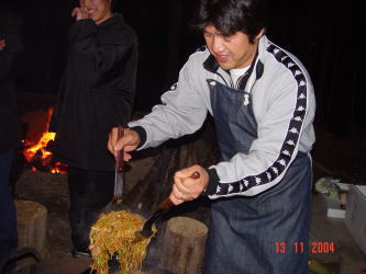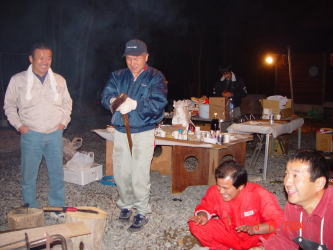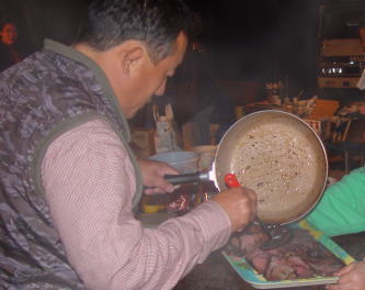 | 肉の塊もあっという間に少しになりました。焼き方がどうのこうのと話は盛り上がります。10cm角の大きさになったころ、肉は棒から外され、1cmの厚みにカットされました。 コック長さんがトリュフもどき入りの特製のソースをすばやく作って下さいました。 すごくいい香りに、あっという間に人垣が出来て、完食されました。最高に美味しかったです。・・・酔ってるはずなのに、すごい。>コック長さん |