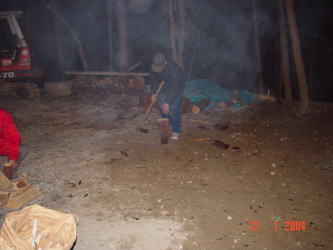 | 朝の5時まで皆で話しながら片付けとかしていたようです。12時以降にうえにし電化の社長さん、上西さんも合流され、3時くらいまではかなりの人がいたようです。 | おのが壊れてしまい、オートスポーツナイトウの源さん実弟、頼重さんが直されています。皆さんの講釈が聞こえてきます。頼さん節はアナ西元兄弟にあってはタジタジ?、そんなことはなく、皆の笑い声がいつまでも山小屋に響きます。 |