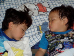 | 宮崎のナイジェリア山本さんちの琉ちゃん(2才) 眠ってる草ちゃん(3才)と琉ちゃん(2才) |