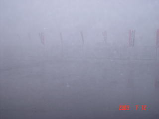 | が、しかし・・・オートポリスではこういう事があるのです。 かなり昔にも源さんは、ジムカーナのツアーシリーズで経験していました。濃霧と豪雨と落雷。時速10kmほどのスピードでさえ前方5mも見えないというのです。 |
