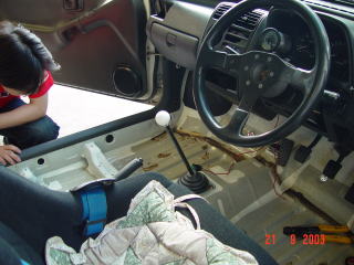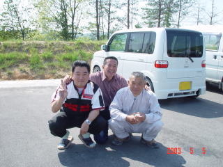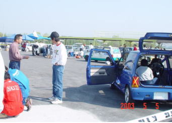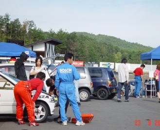 タカタサーキットに到着したらパドックを取ります。車を下ろしましたが、いつもの場所が空いてないので別のところに停めました。少しするといつもの場所が空いたのでそこに移動します。「セルボを運転させてもらっていいですか」と聞き、初めて運転して移動してみます。「どきどき」。う〜ん??クラッチミートの位置が私の感覚の場所と少し違い深い!!みたい・・・どうしよ。ノッキングしてしまう。思い切って言ってみます。「あの〜、クラッチが・・・」藤井さんが「あとで調整するよ」と言ってくださり安心。でも・・・私にホントに走れるのでしょうか。リアブレーキがロックしやすくロックしてると解らない私には非常に危険だと源さんから教えていただき、「無理だ〜・・・、踏めない!!どうしよ、それを聞いただけで恐い!!」どんな車でもレースとなれば勝つことが目的、真剣に遊ぶ。源さん、藤沖くんと組むなんて私には到底無理なことだったのかもしれません。