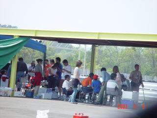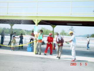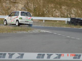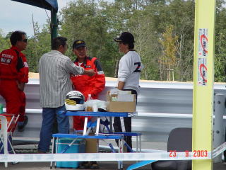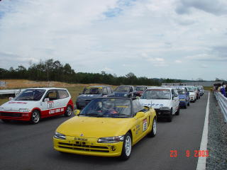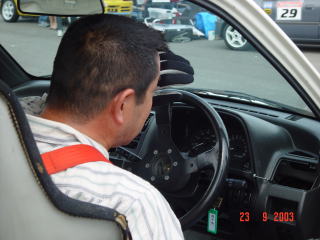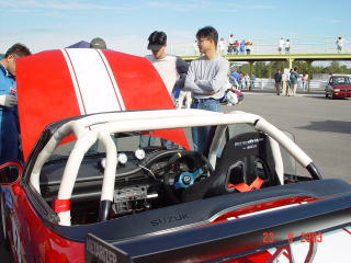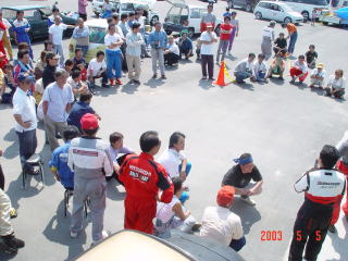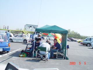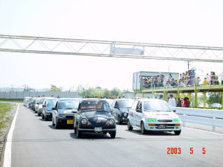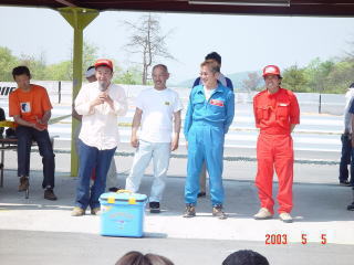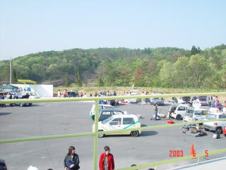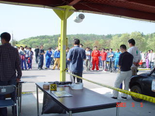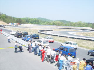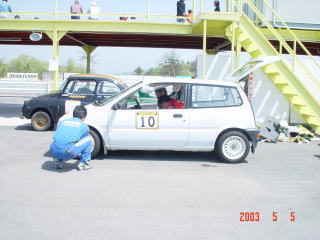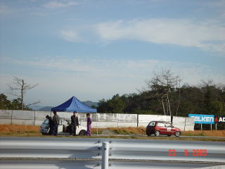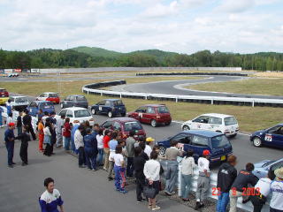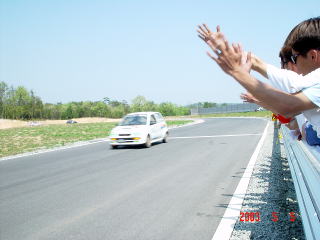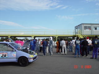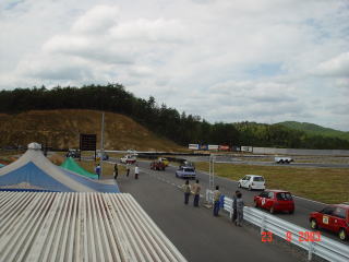 ターボクラスいよいよスタートです。何秒が出ているのかわかりませんが、3周くらいでP.P.のカプチーノと2番グリッドのナイトー1号に抜かれてしまいました。私が走っている間に何周、パスされるのでしょうか。レールの上しか走れない初心者ですので皆さんに大変ご迷惑かけてすみません。コーナースピードもめちゃくちゃ遅くて、ヒールアンドトゥもできず、とにかく私なりに一番短いラインを走るのが良いみたいです。ついついランサーの癖でガツンとやってしまいます。・・・すみません、ごめんなさいと何度も独り言です。3速に入れるのが下手で・・・ガギッと変な音・・・またまたごめんなさい、壊さないようにしなければ。何周かしているうちに黄旗です。???あれ??ナイトー1号が見えません、あら???1コーナー奥で止まっています。それでも・・・私は走らなければいけないのか??どうしようか??考えてしまいます。何周走ったのか、時間を見る余裕もありません。サインも出ていないし・・・。走るべきでしょうねぇ。ピット上を見てもわれらがナイトーのピットクルーは見えません。ひたすら走りましょう。1周。2周。コントロールラインをすぎて1コーナーへ・・・・ひぇ〜・・・こわ〜い、何がおこった?もうタイヤがすべる時期なのでしょうか??・・・スピンです。皆がたくさんいる前で・・・ごめんなさい。自分の車がどんな動きをしたかさえ判りません。目をつむっていたのでしょうか・・・下手だ〜。なんとか事なきを経て、3台に何度目かのパスをされ、またまた走ります。う〜、恐い。ちょっと躊躇です。ゆっくり走ってしまいます。1周。2周。またまた黄旗??あれ〜?別の車がスピンして止まっています。それをパスして最終コーナー。赤旗です。ピットインしようかと考えましたが、うちの皆はきっといないし、サインが出てからにしましょう。赤旗でコース上にストップです。オイルが出ていたということです。・・・。そうだったのか〜、何もわからない素人はホントに危ないですね。早く入ったほうが良かったのでは・・・。ミラはリタイヤだと聞きました。藤沖さんがまだ30分経過していないので走ってと言うので、またまた走ります。だんだん調子はのってきました。ピットサインが出たのでピットインです。