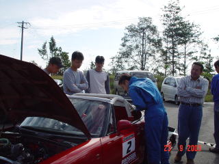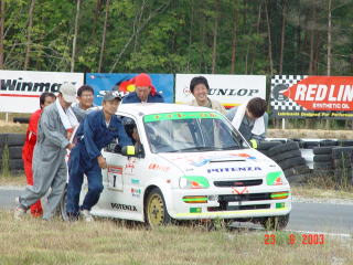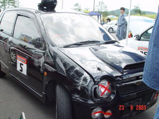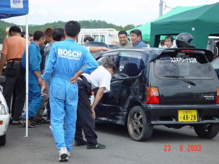 ミラがリタイヤして皆が集まっている目の前でオイルがこぼれていたらしくスピンして危うくリタイヤとなるところでした。皆はドキッとしたみたたい。運が良かっただけ・・・、よく考えればその可能性があると考えつかない私がおかしいですよね。ひっくり返っていたら大変でした!!