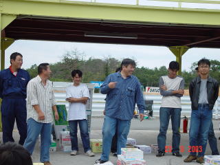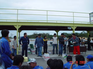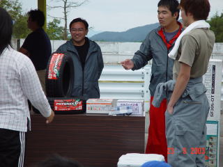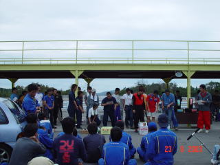 源さんが、「ミラはリタイヤだし、せっかく皆が2台でエントリーしたのだから、勝ちにいける車ではないし、皆で順番に走ろうよ、時間配分してみて。」と言われました。藤沖さん、山中さん、藤井さん、たっちゃん、それに源さんが乗ればいいと思うというと源さんは自分は乗らなくていいといいます。私は源さんにも乗ってもらい車の特徴をみて貰いたいし、全員で走ってこそ意味があると思いました。皆が一生懸命走ってくださり、20分〜30分乗っているとリタイヤ車両も出てきて、遅いながらセルボもエンジンが快調になってきて藤井さんが走ってくださっているときにはまたまた掲示板にゼッケンが表示されていました。やはり残り40分をたっちゃんと源さんに走ってもらおう。たっちゃんがまたまた「僕は乗らなくていいです。」なんて言うのを、「そんなこと言う人がいたら、皆が面白くないんだよ」と言って了解を得て、源さんにも一生懸命走ってもらえるように頼みました。体調が悪いからと言っていましたが、少しするとヘルメットを片手にピットに来られました。やはり血の気が騒ぐのでしょうか?、それとも私がしつこかったからでしょうか・・・ごめんなさい。源さんに現在4位で3位のチームと同一周回なのでその車を出来れば抜かしてくださいとお願いしました。約半周遅れています。主催者の方がびっくりするくらいの速さでドライバーチェンジをすませ、源さんはコースへ入っていきます。すぐに車両の調子やレースの状況が把握できるのか源さんはビュンビュン走ります。3位のチームが59秒、源さんが57秒だと2秒差。残り20分で、うまくいくとなんとかクリアできる予定です。がんばれ〜。見ていると微妙に縮まっているのが解ります。源さんも解っているのでしょうか。源さんセルボはパスする車がいない時には56秒台が出始めました。快調に走ります。10分くらいたったところで射程圏内でした。見事にクリアしました。しかしすぐ後ろを走っていますので気を抜くわけにはいきません・・・。と思いきや、源さんは後ろのことなど考えていない様子。2位の車両とは3ラップ差ですがその車両をまず抜かし、2ラップ差にします。そしてバトルしています。レースを楽しんでいます。2位の車のほうがストレートが速いのかピッタリとくっついてきます、が何周かするうち最終コーナーでなぜか変な動きになっています。少し離れていきました。私がもう少し頑張っていれば2位も夢ではなかったということですかねぇ。遅い車でも積み重ねなんだなぁと思いました。そして3周目。あと2分で終了というところのS字で2位の車は横転してしまいました。・・・がそのまま起き上がり走ってピットインしました。ナイトー2号源さんは最終ラップを走りきり2位と1ラップ差で無事ゴールしました。シェイクダウン ナイトー2号は見事3位入賞でよかったです。