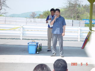 走行の順番を決めます。どこが走りたいかといわれます。2番目が無難かなと思いましたが・・・源さん、藤沖さんが1番目に好きなだけ走りんさいと言われ、30分だけ走るので時間になったら教えてくださいといいました。そして、他にも異常がありそうだったら言ってくださいねとお願いして・・・9台エントリーの6番グリッドでスタートすることになりました。ローリングスタートだからなんとかなりますね。タイヤのねじも確認して、空気圧も見て、乗りやすくなっているから大丈夫だという藤沖さんの言葉に安心して出発です。