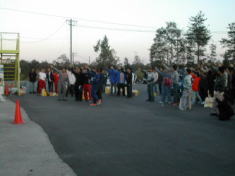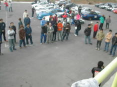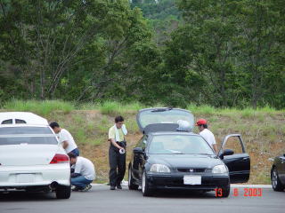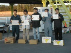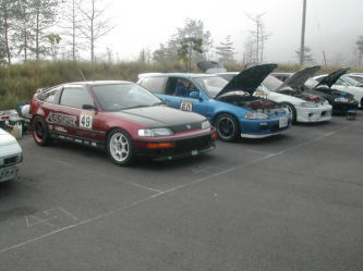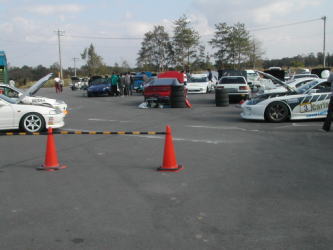 工大主催のタカタタイムアタックに行ってきました。10/4のモンテタイムアタックに続き今月2回目のタイムアタックになります。前回は自己ベストを更新する事ができたが,今回はどうなるか・・・自分との戦いです。 ■ 前日 前日は,毎度の事ながら洗車に荷物の積み込みです。荷物・・・これが結構あります。 ちょっと紹介すると,タイヤ8本,工具一式,ドライブシャフト(左右),ジャッキ,空気注ぎ,ガソリン20g,テント(イージーアップ)クーラーボックス,折りたたみイスにテーブル・・・といった感じです。おいら車はバックミラーで後ろが確認で きないほど,荷物満載です。ここまでもっていかなくてもいいのだが,何かあったらどうしよう?とおもうとどうしても,それに対応する物をと考えると持って行くようになります。 まあ,以上が前日の準備です。当日に備えて早く寝ようと思うのですが,いつも前日は寝れません。子どものころ遠足の前の日は楽しみで興奮して寝れないみたいな感じです。この日も3時まで記憶があります。 ■ 競技説明 この競技は,タカタサーキット1周約1キロを,クラスごと約6台(持ちタイム順)で別けて,約6分のタイムアタックを5回ぐらい行います。その中のベストタイムで順位を決定します。ジムカーナと違い走る回数も多く,天気や気温などでも タイムが変わり,一番いい状態でいかにタイムが出せるか・・・ですね。 ジムカーナは,午前・午後1本づつで,モチベーションを高めての1発勝負ですが,このタイムアタックは合計5〜6回のタイムアタックができ,約1日で30周以上走ることもできて,楽しめる・・・がタイムはなかなか思うようには出ない。走 れば走るほどはまって行きます。タイヤもツルツルになります(笑) ■ 当日 当日の朝はだいたいジムカもタカタも朝5時30分に目覚ましをセットしています。でもだいたい5時ごろには,目がパッと覚めるんです。これは不思議・・・6時過ぎに家を出てコンビニで源さんと,たっちゃんと待ち合わせて昼飯など購入し,いざタカタ へ!待ち合わせ場所からやく1時間でタカタに着きました。タカタのゲートでは学生が両サイドに並び,「おはようございます」とあいさつを!とても気持ちがよく元気が出ます。これはオールドスターの時も見習わないと! さて,到着したものの,タカタは霧に包まれぼんやりとしかコースが見えません。気温も7℃(近くの道の温度計)とても寒い! ■ 開会式&ドラミ 今回はゼッケン1番・・・気持ちいいですね。(多分この前のモンテの時に学生を乗せて走ったからかな?)2番ゼッケンはインテRの新井君今日の一番のライバルになりそう。 タイヤ交換はたっちゃんに手伝ってもらい(おいらはほとんど何もしなかった。まるでワークス体制)準備も早くでき,8時半から開会式・・・とおもっていたら,なんだか車検とかで,開会式が9時からになってしまいました。学生イベントな ので,段取りが・・・