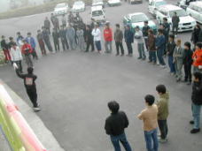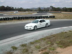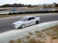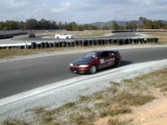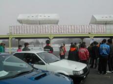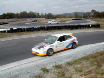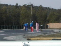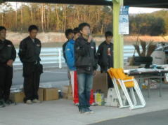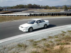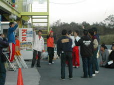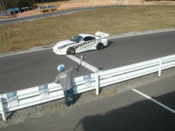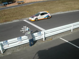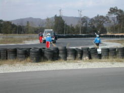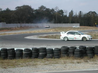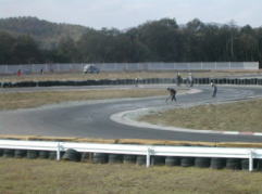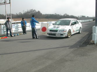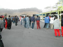 ■ いよいよコースイン 9時30分より1本目が開始・・・先ずは源さんがデモ走行を!この寒いのに48秒台を連発しますさすがです。 霧はだいぶん晴れたものの,路面に手を当ててみるととても,冷たくタイムは1本目は駄目だと思い今日は2本目に勝負かな(タイヤは2本目に備えて,溝が無いタイヤを履かせていた) いつもの事ながらスタートは緊張します。日の丸が振られコースイン!タイヤを暖めながら最終コーナーを抜けて,タイムアタック開始!いきなり1コーナーでフルカウンター!2コーナーを何とか切り抜け,バックストレート3速全開で下りの3コー ナーへ・・・ここでもリヤが出てカウンターを当て気味に登って4コーナーへ内週を1速で切り抜けて最終コーナーをアウト一杯からインへ付けて加速しながらアウト一杯に立ち上がり・・・タイムは50秒後半 2本目はタイヤもあったまり1コーナーもリヤが すべることなく無難に!他のコーナーもそれなりに走ることができ,タイムは49秒7・・今の状態でこのタイムがでれば,新しいタイヤでもう少し気温が上がれば,48秒台も夢では無いのでは・・・しかし・・・。