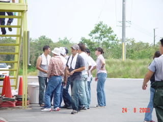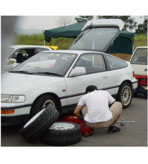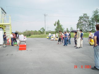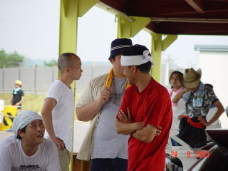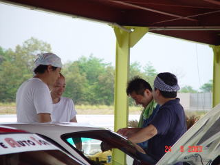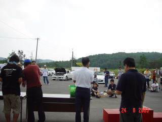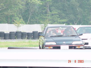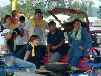 さあ,コースイン。このコースはタマダを少し高速にしたようなコースで,個人的には好きなコースです。シビックで早い人は1周を48秒ではしるのですが,気にしない気にしない。私のライバルは職場の先輩のK氏,昔一緒にジムカをしていた岸君,古○さん,音○氏です。さあ一本目スタートです。今日は前回のボロタイヤとちがい55Sです。うふふ・・・これは前回より大幅タイムアップだぞ。K氏に挑戦だぁ。緩やかな1コーナーを抜け,ヘアピンに突入,お尻をふりながらコーナーをクリアーーー,ガシャンボキボキ エンジンからまわり。なんだなんだまたドラシャがおれちゃったよ!今日は暑いからあまり作業はしたくないんだよなあ。でもそんな簡単なもんじゃなかった。ドラシャのナットが外れない・・・いくらやっても外れない。無理にやっていたら工具がボキ。前回はオーバーヒートではしれなかったが今回はたった3週で今日がおわるのか・・・。しかし,源氏さん頼重さんにたすけてもらい何とかナットがはずれたので,昔をおもいだしながらシャフトの交換。現役時代は20分もかからないくらい何本もかえた経験が生き,スムーズに交換が終了。しかし時はすでに12時を回っていました。