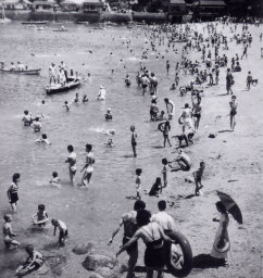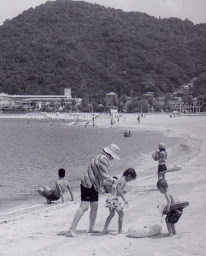 | S30頃の狩留賀海水浴場、プールや公園など遊具のない時代は海水浴はとても楽しみでした。整備された現在の海浜公園には人はまばらです。 |