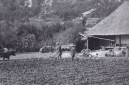 牛を使ってたんぼをたがやしています。