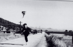 | 郷原、風景は変わらないように思えますが、現在はこの道をすごい数の車が行き交います。まして凧揚げなど出来るはずがありません(S40年頃)、私も上げていた凧が飛んでいってしまい、すごい距離を凧を追いかけて走った覚えがあります。車などいなかったのでしょうか(笑) |